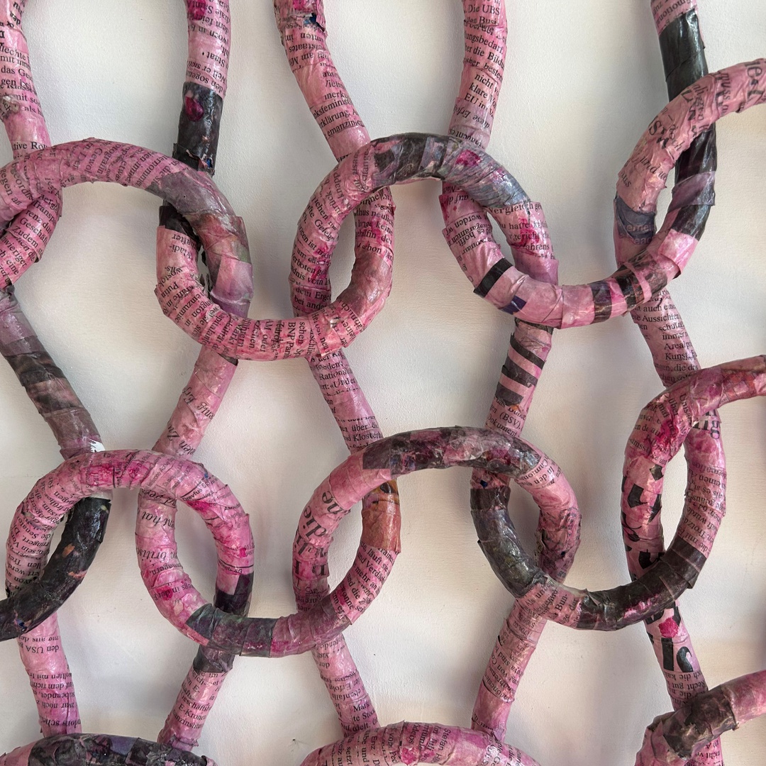 In ihren neuen Arbeiten widmet sich die Vorarlberger Künstlerin Rita Singer den komplexen Krisen und globalen Verflechtungen unserer Gegenwart. Unter dem Titel „Verstrickungen“ zeigt sie Werke, die aus Alltagsmaterialien – vor allem Tageszeitungen – sowie textilen und plastischen Elementen entstehen. Gerade jene Zeitungen, die viele von uns tagtäglich am Frühstückstisch lesen, dienen ihr als Ausgangspunkt für eine künstlerische Auseinandersetzung mit Krieg, Pandemie, Klimakrise und weltweiten Fluchtbewegungen.